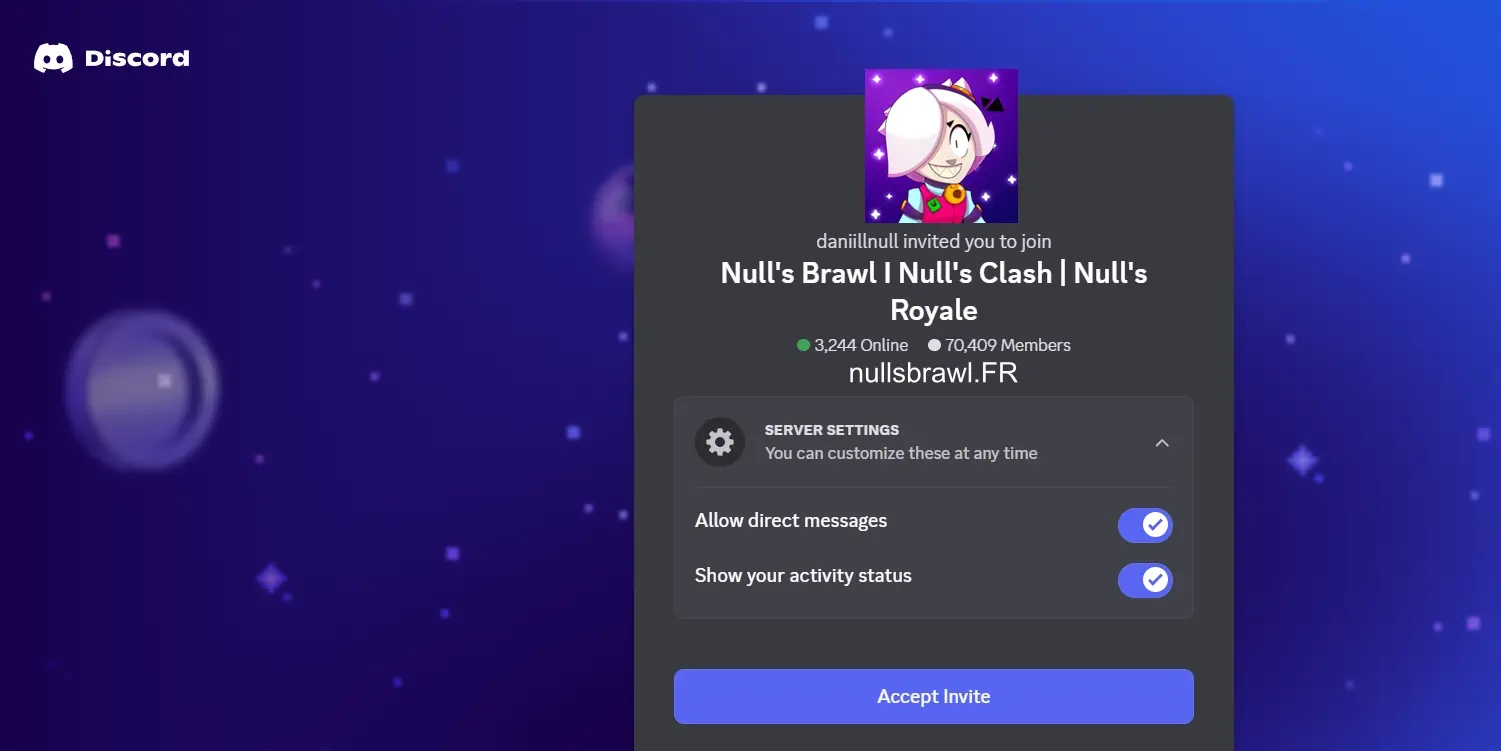 Cliquez sur le lien d’invitation officiel Nulls Brawl Discord. Les liens non officiels mènent souvent vers des serveurs clones remplis de scams.